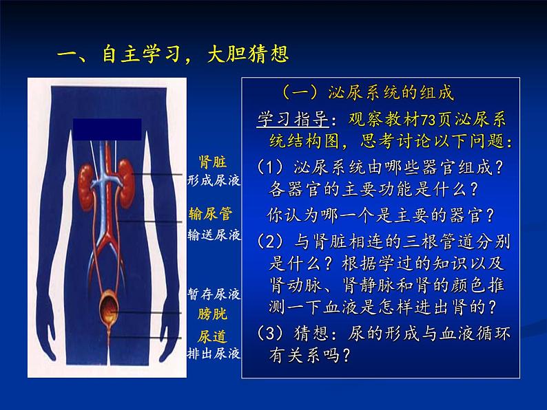 (一)泌尿系统的组成 学习指导:观察教材73页泌尿系统结构图,思考讨论以下问题:(1)泌尿系统由哪些器官组成? 各器官的主要功能是什么? 你认为哪一个是主要的器官?(2)与肾脏相连的三根管道分别是什么?根据学过的知识以及肾动脉、肾静脉和肾的颜色推测一下血液是怎样进出肾的?(3)猜想:尿的形成与血液循环有关系吗?
