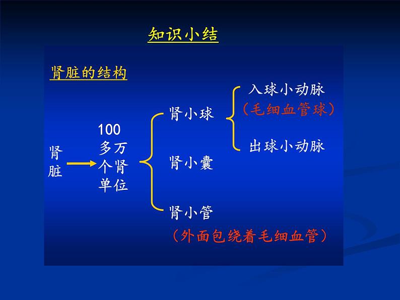 学习指导:阅读73页文字和图4-44观察思考:1、什么是肾单位,由哪几部分组成?2、肾小球是球吗?它的两端的结构分别是什么?粗细一样吗?里面的液体是什么?3、呈囊状的结构是什么?它与谁相连?分析讨论:4、肾小囊和肾小管壁有什么特点?5、肾单位哪两处有毛细血管绕?6、毛细血管的结构特点是什么?