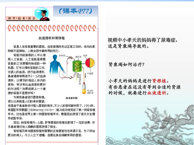 这是一份人教版 (新课标)七年级下册第四单元 生物圈中的人第五章 人体内废物的排出课文内容ppt课件,共13页。PPT课件主要包含了七岁男孩捐肾救母,我想了解,课本P77,输尿管,形成尿液,输送尿液,暂时贮存尿液,排出尿液,泌尿系统,课本P73等内容,欢迎下载使用。