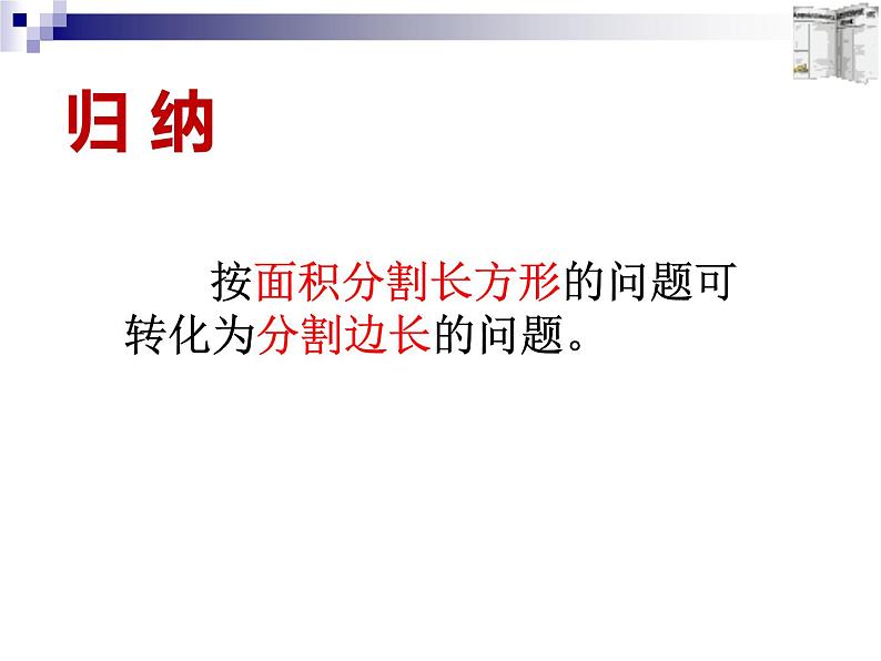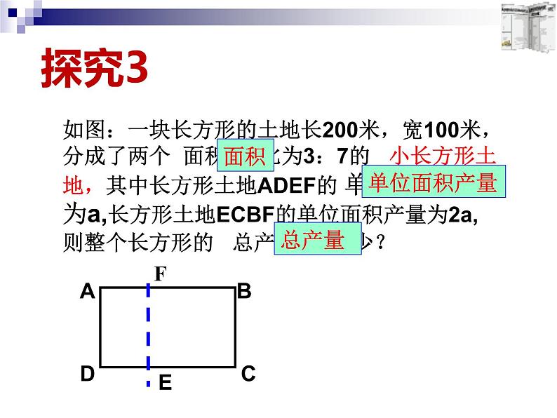 实际问题与二元一次方程组 ---面积专题第八章二元一次方程组 荣昌区初中数学学科工作室 河包镇初级中学 李明容 探究11、一块长方形的土地长200米,宽100米,要分成面积之比为1:1的两个小长方形,该怎样分呢?探究22、一块长方形的土地长200米,宽100米,要分成面积之比为3:7的两个小长方形,该怎样分呢? 按面积分割长方形的问题可转化为分割边长的问题。归 纳如图:一块长方形的土地长200米,宽100米,分成了两个 面积 之比为3:7的 小长方形土地,其中长方形土地ADEF的 单位面积产量 为a,长方形土地ECBF的单位面积产量为2a,则整个长方形的 总产量 为多少?探究3ADCB面积单位面积产量总产量ABCD●E┓xy例1:甲、乙两种作物的 单位面积产量 的比是 1:2,现要在一块 长200m,宽100m 的长方形土地上种植这两种作物,怎样把这块地分为两个长方形,使甲、乙两种作物的 总产量 的比是 3 : 4 ? 应用数学、解决实际问题F解:设AE为 x 米,BE为 y 米,甲的单产面积为a,由题意得:ABCD●E┓xy答: 过长方形土地的长边上离一端120米处,把这块地分为两个长方形.较大一块地种甲种作物,较小一块地种乙种作物.FABCD●E┓yx解:设CE为 x米,BE为 y 米,甲的单产面积为a,由题意得:答: 过长方形土地的短边上离一端40米处,把这块地分为两个长方形.较大一块地种甲种作物,较小一块地种乙种作物。F收获与感悟再见