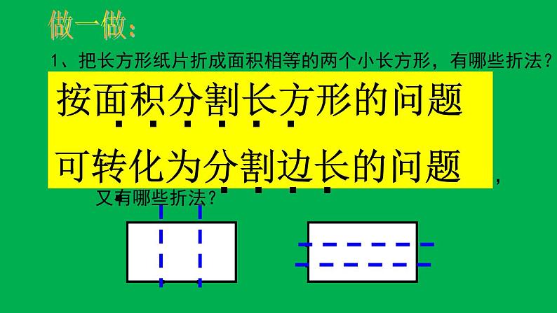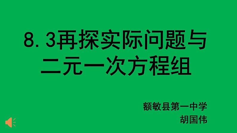 一切问题都可以转化为数学问题,一切数学问题都可以转化为代数问题,而一切代数问题又都可以转化为方程问题,因此,一旦解决了方程问题,一切问题将迎刃而解! ——法国数学家 笛卡儿 8.3再探实际问题与二元一次方程组额敏县第一中学 胡国伟 利用二元一次方程组解决实际问题的一般步骤: 审 清题意,找出等量关系; 设 未知数x和y; 列 出二元一次方程组; 解 方程组; 验 检 验; 答 答 题.复习回顾做一做:1、把长方形纸片折成面积相等的两个小长方形,有哪些折法?2、把长方形纸片折成面积之比为1:2的两个小长方形, 又有哪些折法?●●●●探究2 据统计资料,种植茄子、西红柿的单位面积产量的比是1:2 ,现要把一块长 200m、宽100 m的长方形土地,分为两块小长方形土地,分别种植这两种作物.怎样划分这块土地,使茄子、西红柿的总产量的比是3:4? 问题探究xy: = 3:4数形结合建模思想x+y=200列表法建模思想列表法一题多解数形结合转化思想学有所思, 感悟收获! 作业: 习题8.3 第4、5题.感悟数学,体味生活!