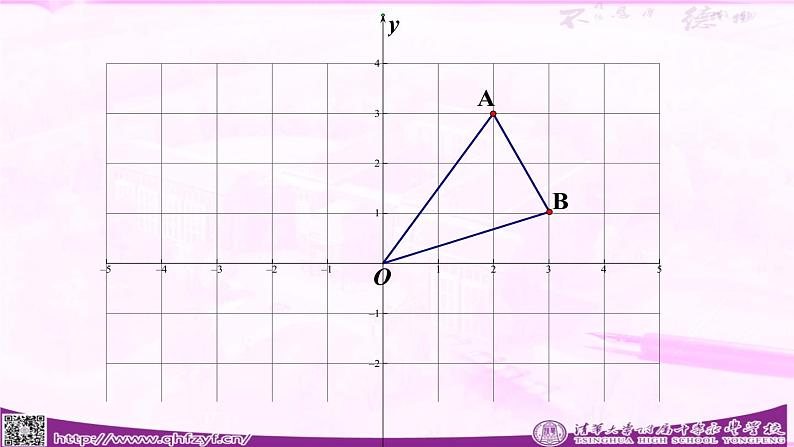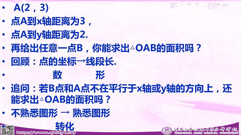 A(2,3)点A到x轴距离为3,点A到y轴距离为2.再给出任意一点B,你能求出△OAB的面积吗?回顾:点的坐标→线段长. 数 形 追问:若B点和A点不在平行于x轴或y轴的方向上,还能求出△OAB的面积吗?不熟悉图形 → 熟悉图形 转化