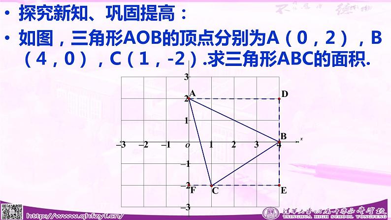 探究新知、巩固提高:如图,三角形AOB的顶点分别为A(0,2),B(4,0),C(1,-2).求三角形ABC的面积.