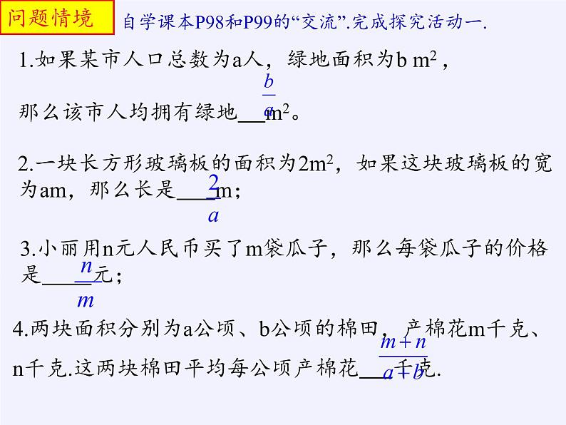 1.如果某市人口总数为a人,绿地面积为b m2 ,那么该市人均拥有绿地 m2。