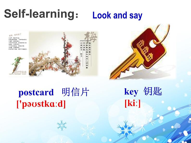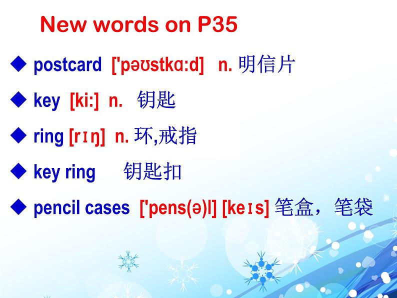 pstcard ['pəʊstkɑ:d] n. 明信片key [ki:] n. 钥匙ring [rɪŋ] n. 环,戒指 key ring 钥匙扣pencil cases ['pens(ə)l] [keɪs] 笔盒,笔袋