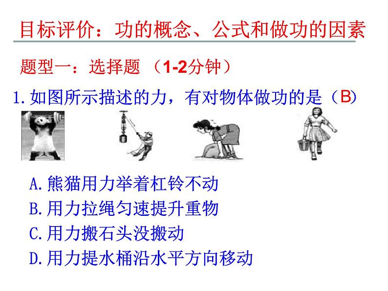 1.如图所示描述的力,有对物体做功的是( ) A.熊猫用力举着杠铃不动 B.用力拉绳匀速提升重物 C.用力搬石头没搬动 D.用力提水桶沿水平方向移动