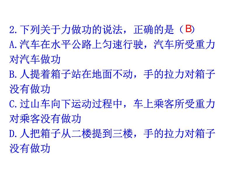 2.下列关于力做功的说法,正确的是( ) A.汽车在水平公路上匀速行驶,汽车所受重力对汽车做功 B.人提着箱子站在地面不动,手的拉力对箱子没有做功 C.过山车向下运动过程中,车上乘客所受重力对乘客没有做功 D.人把箱子从二楼提到三楼,手的拉力对箱子没有做功