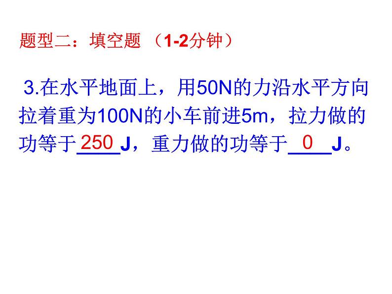 3.在水平地面上,用50N的力沿水平方向拉着重为100N的小车前进5m,拉力做的功等于____J,重力做的功等于____J。