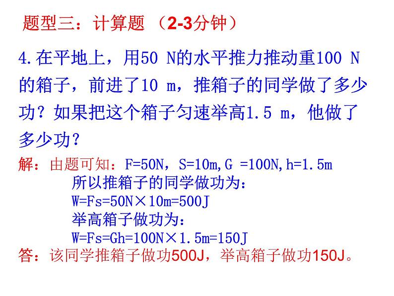 4.在平地上,用50 N的水平推力推动重100 N的箱子,前进了10 m,推箱子的同学做了多少功?如果把这个箱子匀速举高1.5 m,他做了多少功?