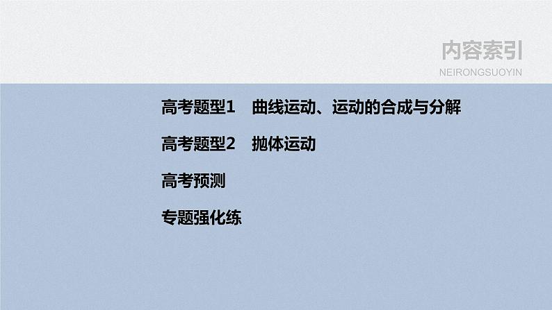 1.命题角度:(1)曲线运动、运动的合成与分解; (2)抛体运动.2.常考题型:选择题、计算题.
