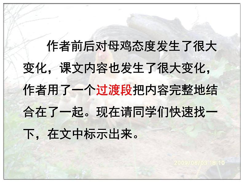 作者前后对母鸡态度发生了很大变化,课文内容也发生了很大变化,作者用了一个过渡段把内容完整地结合在了一起。现在请同学们快速找一下,在文中标示出来。