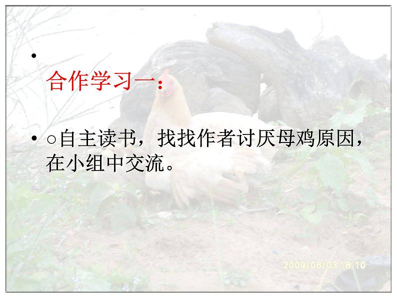 合作学习一:○自主读书,找找作者讨厌母鸡原因,在小组中交流。