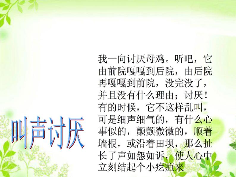 看来作者的确讨厌母鸡,后来为什么又不敢讨厌母鸡了呢?接下来让我们继续解决“我”不敢讨厌母鸡的原因,读后面的内容,先找一找讨厌母鸡概括性语句(用文中语句),标一标。