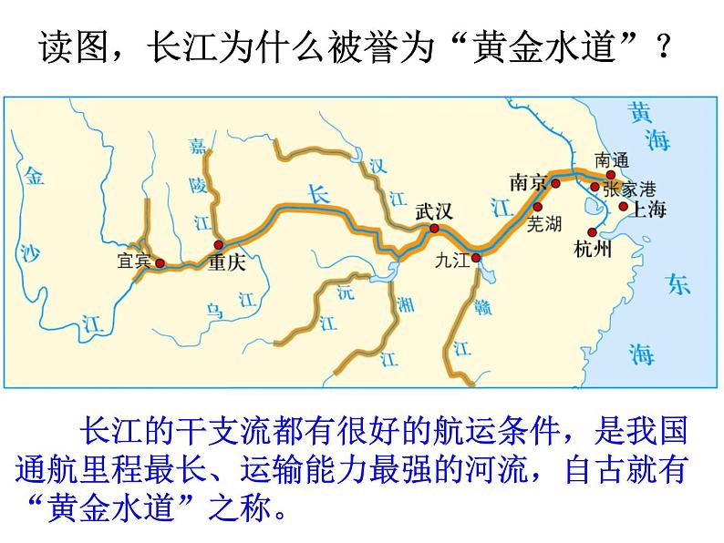长江的干支流都有很好的航运条件,是我国通航里程最长、运输能力最强的河流,自古就有“黄金水道”之称。