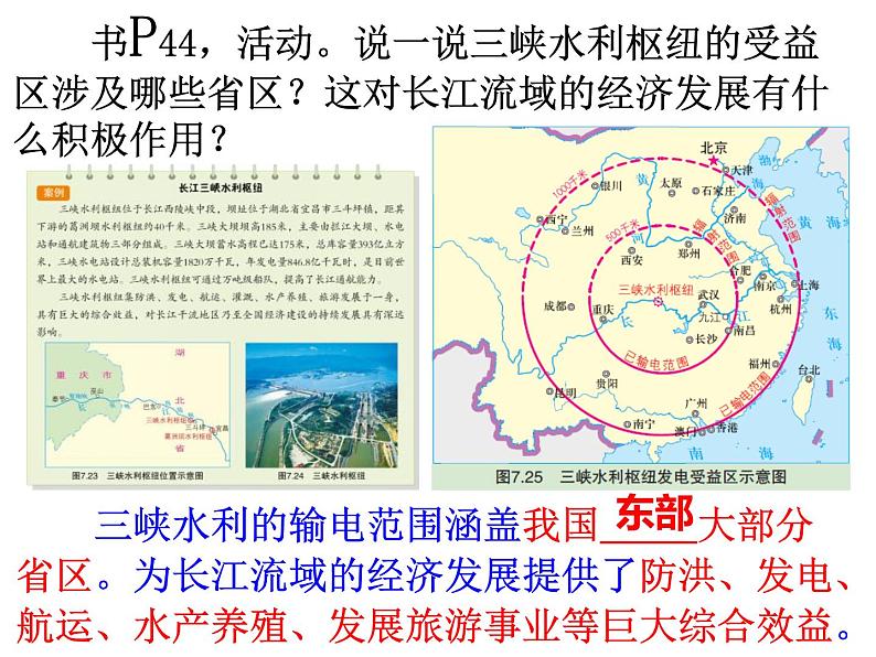 书P44,活动。说一说三峡水利枢纽的受益区涉及哪些省区?这对长江流域的经济发展有什么积极作用?