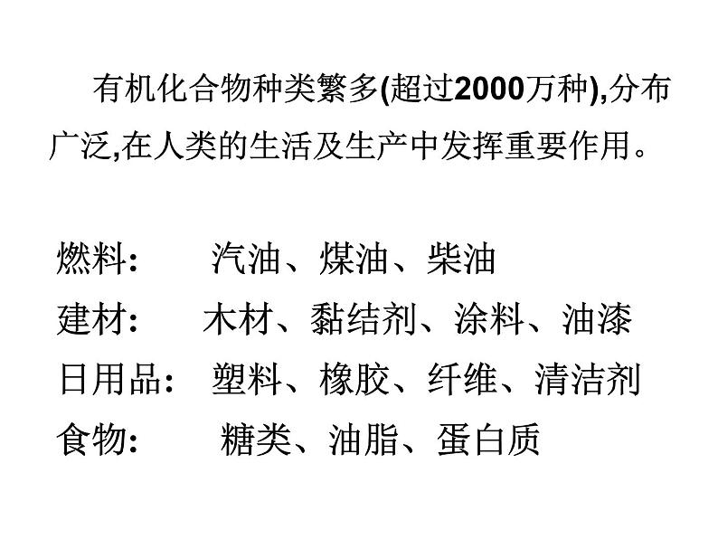 有机化合物种类繁多(超过2000万种),分布广泛,在人类的生活及生产中发挥重要作用。