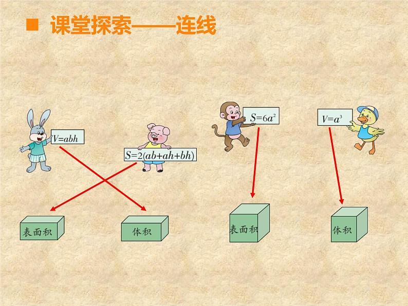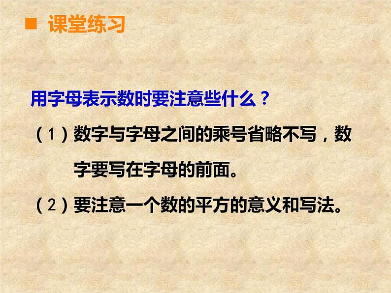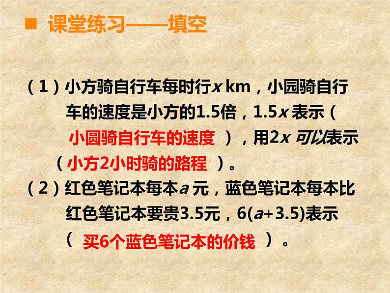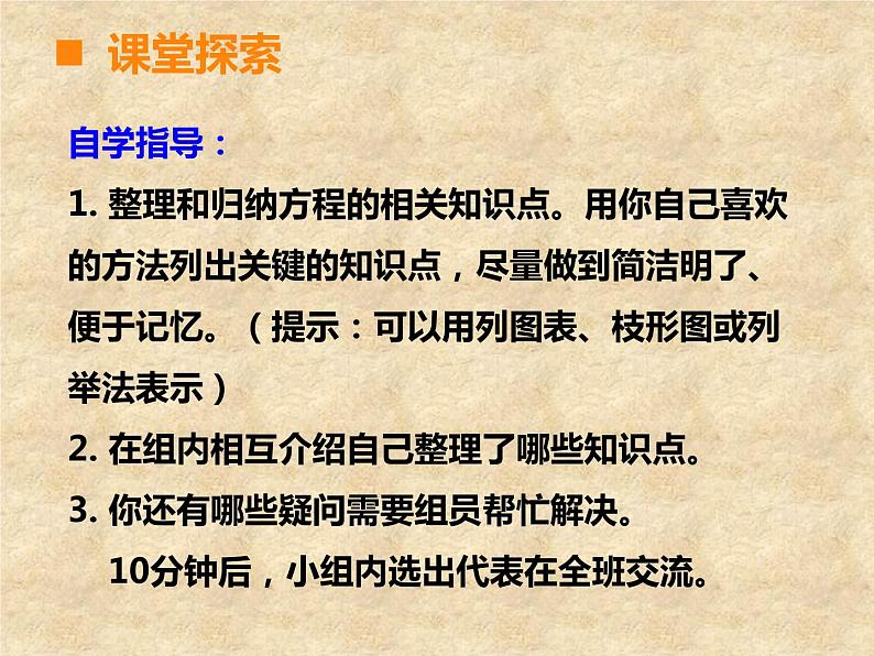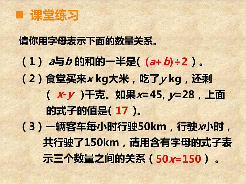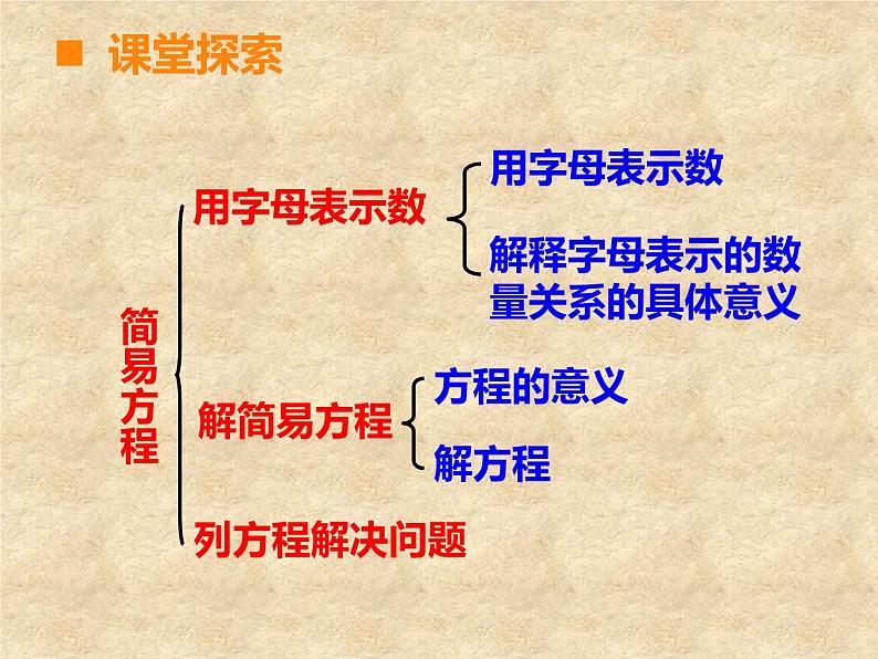 总 复 习第4课时五年级下册第七单元课堂引入 一起来回忆一下这学期我们学习了哪些关于方程的知识?自学指导:1. 整理和归纳方程的相关知识点。用你自己喜欢的方法列出关键的知识点,尽量做到简洁明了、便于记忆。(提示:可以用列图表、枝形图或列举法表示)2. 在组内相互介绍自己整理了哪些知识点。3. 你还有哪些疑问需要组员帮忙解决。 10分钟后,小组内选出代表在全班交流。课堂探索简易方程用字母表示数解释字母表示的数量关系的具体意义方程的意义解方程列方程解决问题课堂探索课堂练习用字母表示数时要注意些什么?(1)数字与字母之间的乘号省略不写,数 字要写在字母的前面。(2)要注意一个数的平方的意义和写法。课堂探索——连线(2)食堂买来x kg大米,吃了y kg,还剩 ( )千克。如果x=45, y=28,上面 的式子的值是( )。(3)一辆客车每小时行驶50km,行驶x小时, 共行驶了150km,请用含有字母的式子表 示三个数量之间的关系( ) 。请你用字母表示下面的数量关系。课堂练习(1) a与b 的和的一半是( ) 。(a+b)÷217x-y50x=150(1)小方骑自行车每时行x km,小园骑自行 车的速度是小方的1.5倍,1.5x 表示( ),用2x 可以表示 ( )。(2)红色笔记本每本a 元,蓝色笔记本每本比 红色笔记本要贵3.5元,6(a+3.5)表示 ( ) 。课堂练习——填空小圆骑自行车的速度小方2小时骑的路程买6个蓝色笔记本的价钱(1)一天早晨的温度是a°C,中午比早晨高 7°C ,中午的温度是( ) °C 。(2)小李每分打n 个字,小王每分比小李少打 4个字。 n-4表示( ); 8(n-4)表示( ) 。课堂练习——填空a+7小王每分钟打的字小王8分钟打的字将序号填入圈中。⑴ 30+2=32 ⑵ 3×X ⑶ X-T=6 ⑷ 4+A>18 ⑸ 25÷v=Z ⑹ 5.6-4=G 方程等式不是等式⑵⑶⑷⑸⑹⑴⑶⑸⑹方程与等式之间的关系等 式方程一定是等式;但等式不一定是方程。方程课堂练习解方程,并选一道题验算。能说一说你的解法吗?课堂练习1. 弄清题意,找出未知数,并用x 表示。2. 找出应用题中数量之间的关系,列方程。3. 解方程。4. 检验,写出答案。回忆一下列方程解决问题的解题步骤吧!课堂练习解:设本月我们打长途电话的时间是ⅹ分钟。0.8ⅹ+19.2=72答:本月我们打长途电话的时间是6.6分钟。市话费+长途话费=应交话费0.8ⅹ+19.2-19.2=72-19.20.8ⅹ=52.8 ⅹ=6.6课堂练习第一关:解方程 4x+17=43 20+6x=35 5x-47=3课堂练习1. 在一个长13m,宽8m的长方体鱼池里有312m3 的水。这个鱼池的水有多深? 2.小红买了3袋奶糖和2袋饼干,一共重2200g。已 知每袋饼干重500g,每袋奶糖重多少克?3. “嫦娥一号”卫星飞行的远月点距月8600km,比 近月点距月的42倍还多200km。“嫦娥一号”卫 星飞行的近月点距月多少千米?第二关:解方程解决实际问题课堂总结