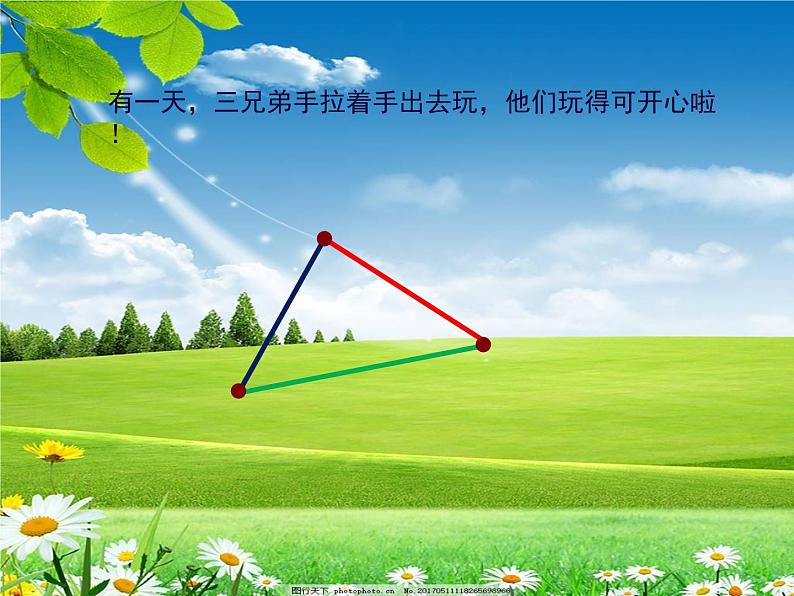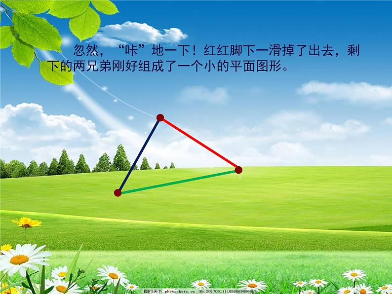 忽然,“咔”地一下!红红脚下一滑掉了出去,剩下的两兄弟刚好组成了一个小的平面图形。