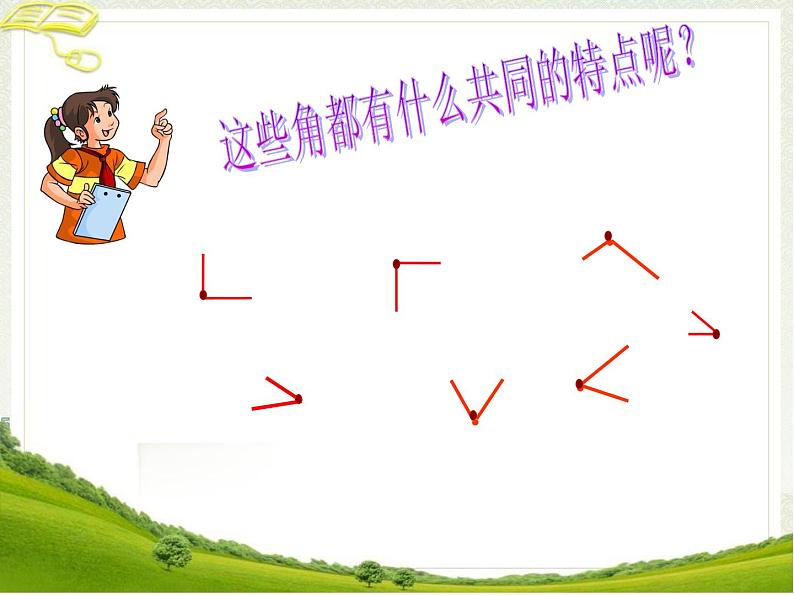 小小角,真简单。一个顶点两条边。要问我的大与小,只看张口不看边。画角时,要牢记。先画顶点再画边。