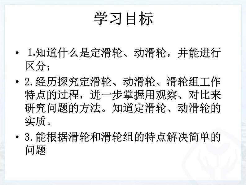 展开⒈知道什么是定滑轮、动滑轮,并能进行区分;2.经历探究定滑轮、动滑轮、滑轮组工作特点的过程,进一步掌握用观察、对比来研究问题的方法。知道定滑轮、动滑轮的实质。3.能根据滑轮和滑轮组的特点解决简单的问题