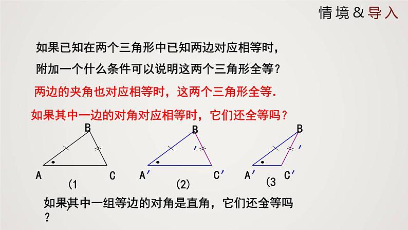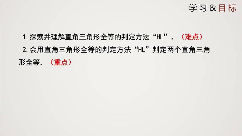 展开1.探索并理解直角三角形全等的判定方法“HL”.(难点)2.会用直角三角形全等的判定方法“HL”判定两个直角三角形全等.(重点)