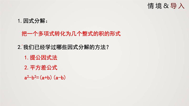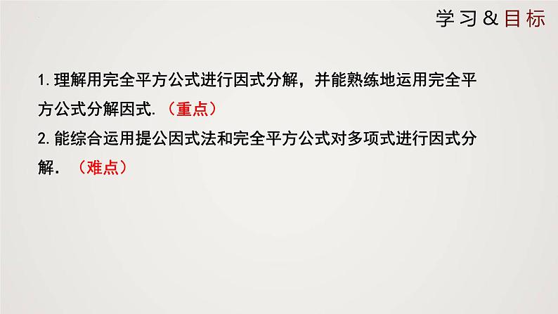 1.理解用完全平方公式进行因式分解,并能熟练地运用完全平方公式分解因式.(重点)2.能综合运用提公因式法和完全平方公式对多项式进行因式分解.(难点)