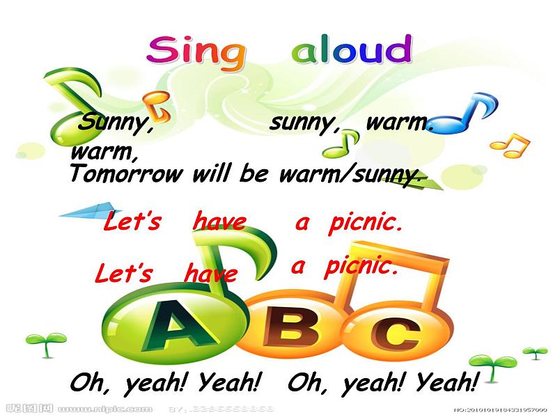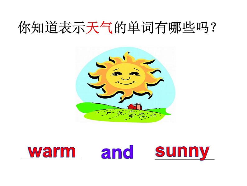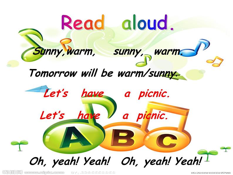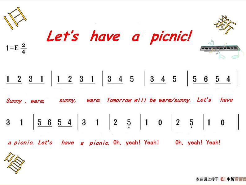 第一课时 Sunny,warm, sunny, warm.Tomorrow will be warm/sunny. Let’s have a picnic. Let’s have a picnic. Oh, yeah! Yeah! Oh, yeah! Yeah!Read aloud. Sunny, warm, sunny, warm.Tomorrow will be warm/sunny. Let’s have a picnic. Let’s have a picnic. Oh, yeah! Yeah! Oh, yeah! Yeah!Sing aloudLet’s have a picnic! Sunny , warm, sunny, warm.Tomorrow will be warm/sunny. Let’s have a picnic. Let’s have a picnic. Oh, yeah! Yeah! Oh, yeah! Yeah!旧新唱have a picnic野餐句型关词汇关话题关过关斩将,赢野餐大奖No.1No.3No.2你知道表示天气的单词有哪些吗?andwarmsunny你知道表示食物的单词有哪些吗? tomatocarrotbananaapple fivetwothreetwoessss你知道表示服装的单词有哪些吗?Thatis cool!jacket句型关词汇关话题关过关斩将,赢野餐大奖No.1No.3No.2你知道?服务员或售货员经常使用的句子是:Can I help you?你知道?询问价格的句子是How much is it?你知道?询问物品主人的句子是Whose…is it ?Whose…are those?句型关词汇关话题关过关斩将,赢野餐大奖No.1No.3No.2 Have a picnicListen and number Read and answer Finish and act That jacket is cool! Whose is it? Can I help you ? Are those cows ? They look hungry. Tomorrow will be warm and sunny. Let’s have a picnic tomorrow. Yes, five tomatoes and two carrots, please. Yeah!Whose tomatoes are those? Three bananas and two apples, please. How much is that?It’s Sarah’s. I like it ,too.That expensive! Moo.That ‘s 42 yuan in total. They’re Sarah’s! Quick!Listen and number ① What will be the weather like tomorrow?② What are the vegetables and fruits they want?③ How much are they in total?④ Whose jacket is it?⑤ Whose tomatoes are those?Read and answer Finish and act