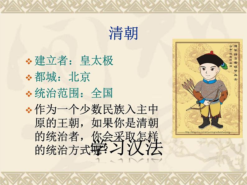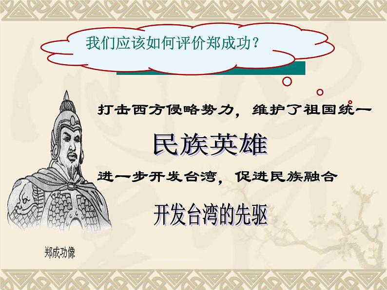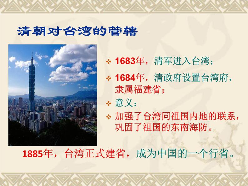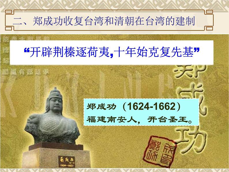 初中历史人教部编版七年级下册第18课 统一多民族国家的巩固和发展授课ppt课件: 这是一份初中历史人教部编版七年级下册第18课 统一多民族国家的巩固和发展授课ppt课件,共24页。PPT课件主要包含了郑成功收复台湾,他从哪里出发,背景荷兰侵占,琉球澎湖巡检司,册封达赖和班禅,达赖喇嘛,“班禅额尔德尼”,设置驻藏大臣,金瓶掣签,设宣政院等内容,欢迎下载使用。