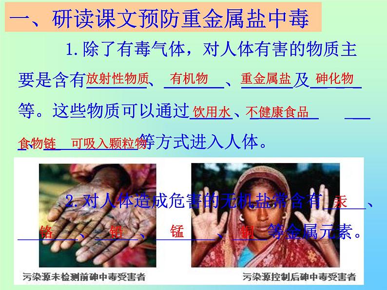 第三节 远离有毒物质学习目标:知道一氧化碳、甲醛、黄曲霉素、重金属盐、烟草、毒品等物质有损人体健康及预防方法。 初步形成关心健康、珍爱生命、远离有毒物质的意识。了解蛋白质的一些重要性质。 第三节 远离有毒物质一、预防重金属盐中毒二、不吃变质食物三、拒绝烟草四、远离毒品一、研读课文预防重金属盐中毒 1.除了有毒气体,对人体有害的物质主要是含有_______、_______、______及__ _ _等。这些物质可以通过_____、_ __ __ _、__ 等方式进入人体。 放射性物质有机物重金属盐砷化物饮用水不健康食品食物链可吸入颗粒物 2.对人体造成危害的无机盐常含有_____、_______、_____、_______、____等金属元素。汞铬铅锰铜实验探究:蛋白质的性质鸡蛋清凝固鸡蛋清凝固鸡蛋清凝固鸡蛋清凝固鸡蛋清变黄无明显现象结论:蛋白质在热、酸、甲醛及重金属作用下发生化学变化,结构就会被破坏,生理活性随之消失。归纳总结 知识提升讨论:1.若不慎误服重金属盐,在去医院 之前可采取哪些方法来缓解症状?2.医院常用下列手段来杀菌消毒,请解释原因:? 煮沸法消毒医疗器械? 注射时用酒精棉球擦皮肤? 紫外线照射病房先催吐再给病人服牛奶、鸡蛋白与豆浆食物,丰富蛋白质与重金属离子作用就减轻中毒毒性注射时用酒精棉球擦皮肤, 因为酒精可使细菌的蛋白质变性..从而杀死细菌。紫外线照射能杀死细菌。二、不吃变质的食品黄曲霉毒素的特征毒性极强远远高于氰化物、砷化物和有机农药的毒性,它的毒性比氰化钾大10倍比砒霜大68倍,其中以B1毒性最大。当人摄入量大时,可发生急性中毒,出现急性肝炎、出血性坏死、肝细胞脂肪变性和胆管增生。当微量持续摄入,可造成慢性中毒,生长障碍,引起纤维性病变,致使纤维组织增生。黄曲霉毒素的致癌力也居首位,是目前已知最强致癌物之一。 具耐热性一般烹调加工温度不能将其破坏,裂解温度为280℃。在水中溶解度较低,溶于油 面对如此食品我该怎么办?学会说:“不”!三、拒绝烟草 烟草有毒你知道吗?烟草中的有害物质一氧化碳:可与人体血液中的血红蛋白结合,使红细胞输氧能力降低,导致人体缺氧,严重时会使人缺氧窒息死亡。尼古丁:剧毒兴奋剂,进入血液循环系统,刺激交感神经,使人产生依赖。焦油:可粘附于咽、和支气管内壁,诱发病变;还可在肺泡堆积,影响呼吸,甚至导致病变。尼古丁与焦油共同作用降低肌体免疫力,诱发疾病甚至癌变。信息链接你知道烟草中哪些物质有毒吗? (1)香烟的烟雾中含有4000多种化学物质,其中大多数是有害的,而最为有害的物质是 、 、 、 、 、 等。(2)香烟中的一氧化碳能与血液中的______结合,导致红细胞输送氧气的能力降低,严重时会使人缺氧窒息死亡。苯一氧化碳甲醛尼古丁焦油重金属盐血红蛋白 烟草有毒你知道吗!四、远离毒品常见的毒品:鸦片、吗啡、海洛因、可卡因、巴比妥类、大麻类可卡因鸦 片吗啡海洛因冰毒摇头丸“毒品万万试不得!”远离毒品就是保护自己!1、根据右边这幅图片,下列说法不正确的是( )。A、血红蛋白也能与一氧化碳结合,结合力比氧气更强B、香烟的烟气中含有很多有毒物质,其中就有COC、香烟中的尼古丁对人体是没有危害的D、长期吸烟的人,易患冠心病、肺气肿和肺癌等2、生活中处处有化学。下列说法中错误的是( )。A、甲醛是一种防腐剂,可用来处理鱼、虾等,保证食品不腐烂B、医疗上常用生理盐水的质量分数为0.9%C、今年春季在很多地方发现了禽流感,为防止传染,应远离家禽的粪便。D、亚硝酸钠(NaNO2)容易被人误做食盐引起中毒检测题CA4、甲醛(化学式为CH2O)是室内空气污染的主要成分,它来源于室内装潢所用的油漆、胶合板、化纤地毯等材料。下列关于甲醛的说法中正确的是( )。A.甲醛分子是由一个碳原子和一个水分子构成的 B.甲醛中C、H、O三种元素质量比是1:2:1C.甲醛分子中C、H、O三种元素的原子数比为1:2:1D.甲醛属于氧化物烟草也是毒品5、右图是一幅关于它的危害的漫画。请就人们的健康生活提出二条建议,并用化学知识说明理由。① 、② 。 3、食品卫生与健康密切相关。下列做法会导致食品对人体有害的是:( )。①用石灰水保存鲜蛋 ②为保持肉制品鲜美,在香肠中加过量亚硝酸钠③蒸馒头时加入适量纯碱④为了让猪长得瘦,用“瘦肉精”(一种含激素的饲料)饲养生猪 A.①② B. ②③ C.①③ D.②④远离烟草保护环境、保护自已及他人健康DC