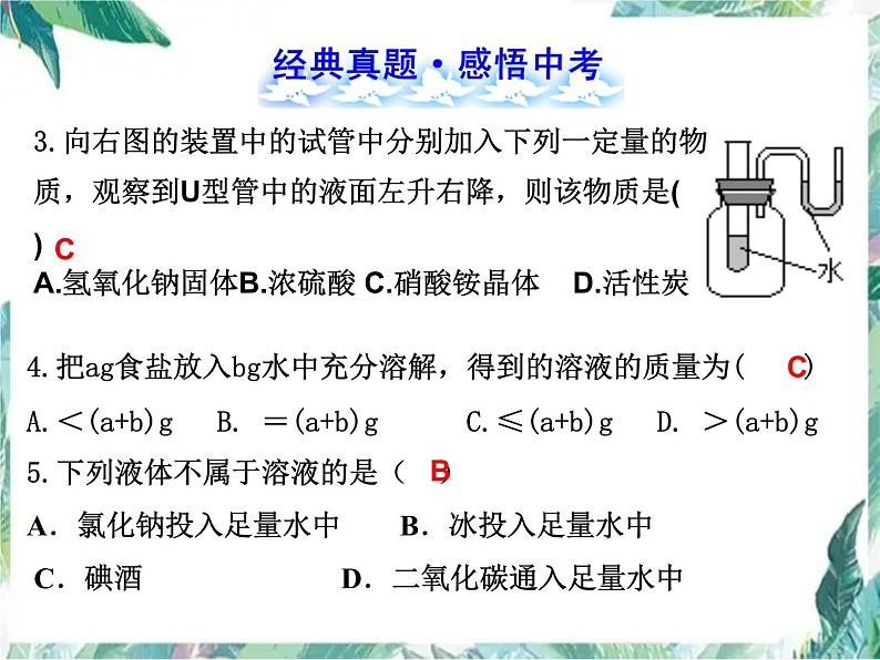 第九单元 溶 液中考化学第一轮复习 溶液的形成1.溶液(1)定义:溶液是_______________分散到___________里,形成_____的、_____的_______。(2)特征:具有_____性、_____性,属于_____物, 溶质:______的物质,可以是__________________。 溶剂:_______________的物质。___是最常用的溶剂。 溶液质量 溶质质量+溶剂质量 溶液体积 溶质体积+溶剂体积一种或几种物质 另一种物质 均一 稳定 混合物 均一 稳定 混合 被溶解 固体、液体或气体 能溶解其他物质 水 (3)组成:澄清透明但不一定是无色的。=≠(4)溶质和溶剂的确定方法当溶液中有水时,不论水的量多少,习惯上把水看作溶剂,通常不指明溶剂的溶液,一般是水溶液.物质在溶解过程中发生了化学变化,在形成的溶液中,溶质包括反应后的生成物,如:锌溶于稀硫酸时,形成的溶液中溶质包括_____,而不是____.2.乳浊液与乳化现象(1)乳浊液:_______分散到液体里形成的_______;其特征是:_______、_______、 _______ 、 _______ 。(2)乳化作用:洗涤剂使植物油在水中分散成无数细小的液滴,形成_______的现象;其特点是能_____存在。小液滴 混合物 不均一 不稳定 乳浊液 稳定 浑浊不透明混合物 3.溶解时的吸热或放热现象(1)溶于水时,溶液温度明显升高的物质有:_______、__________等。(2)溶于水时,溶液温度明显降低的物质有:_______等。(3)溶于水时,溶液温度无明显变化的物质有:_______等。浓硫酸 氢氧 化钠 硝酸铵 氯化钠 【思考感悟】1.均一、稳定、无色透明的液体一定是溶液吗?提示:不一定。均一、稳定的液体可能是纯净物,如水;而溶液属于混合物;溶液不一定是无色的,如硫酸铜溶液就是蓝色溶液。2.用汽油清洗衣服上的油污和用洗涤剂清洗油污的原理相同吗?为什么?提示:不相同。汽油清洗油污属于溶解现象,洗涤剂清洗油污属于乳化现象。 溶液的形成【高频考点】溶液的形成;溶质、溶剂的判断;溶液的性质;溶解过程中的温度变化及应用;乳化作用及应用等1.(泰安中考)溶液在日常生活中应用广泛。下列对溶液的有关说法正确的是( )A.溶液都是无色、透明的液体 B.溶液中只能有一种溶质C.溶液中各部分密度不同 D.溶液中各部分性质相同2.(泰州中考)下列洗涤方法中,利用乳化原理的是( )A.用食醋除水垢 B.用稀盐酸除铁锈C.用汽油清洗油渍 D.用洗衣液洗衣 服DD3.向右图的装置中的试管中分别加入下列一定量的物质,观察到U型管中的液面左升右降,则该物质是( )A.氢氧化钠固体B.浓硫酸 C.硝酸铵晶体 D.活性炭C4.把ag食盐放入bg水中充分溶解,得到的溶液的质量为( ) A.<(a+b)g B. =(a+b)g C.≤(a+b)g D. >(a+b)g5.下列液体不属于溶液的是( )A.氯化钠投入足量水中 B.冰投入足量水中 C.碘酒 D.二氧化碳通入足量水中BC6.写出下列溶液中溶质的化学式:(A)可用于金属表面除锈的稀硫酸溶液(B)医疗消毒用的过氧化氢溶液(俗称双氧水)(C)医疗消毒用的高锰酸钾溶液(俗称紫药水)(D)医疗用的0.9﹪的氯化钠注射液(生理盐水)(E)澄清的石灰水(F)32°的白酒(G)碳酸钙与稀盐酸恰好完全反应后的溶液(H)铁粉溶解在过量稀硫酸中得到的溶液7. 根据溶液的组成填写下表 溶解度1.饱和溶液和不饱和溶液(1)判断依据。(2)二者转化的条件和方法。增加 蒸发溶剂 降温 增加 升温 例题:一杯10 ℃的硝酸钾溶液,能证明它是饱和溶液的方法是( )A.蒸发5 g水有固体溶质析出 B.加入少许硝酸钾晶体不溶C.把溶液降温至 0 ℃有固体溶质析出 D.加入少许蔗糖晶体溶了判断溶液是否饱和的方法(1)若溶液中有未溶解的溶质,则溶液为该温度下的饱和溶液.同样,析出晶体后的溶液,一定是该温度下该溶质的饱和溶液;(2)若溶液中没有未溶解的溶质,可向该溶液中加入少量的同种溶质,若加入的溶质不减少,则原溶液为该温度下的饱和溶液,否则为不饱和溶液。B【误区警示】(1)一定条件下某种溶质的饱和溶液不一定是其他溶质的饱和溶液,如食盐的饱和溶液中还可以再溶解蔗糖。(2)并非所有溶质都能形成饱和溶液,如酒精、硫酸在常温下可与水以任意比例混合。【例】(泸州中考)下列有关饱和溶液的说法中,正确的是( )A.饱和溶液的浓度一定比不饱和溶液的浓度大B.饱和溶液降温析出晶体后的溶液一定是不饱和溶液C.饱和氢氧化钙溶液(石灰水)升温后会变成不饱和溶液D.一定温度下,向氯化钠饱和溶液中加入水后会变成不饱和溶液D【甄别·判断】1.一种溶剂只能溶解一种溶质。( )提示:一种溶剂可以溶解一种溶质,也可以同时溶解多种溶质,如海水中含有多种溶质。 2.稀溶液一定是不饱和溶液,浓溶液一定是饱和溶液。( )提示:稀溶液不一定是不饱和溶液,如石灰水;浓溶液不一定是饱和溶液,如90%的浓硫酸等。可见:(1)对于同种溶质的溶液,在同一温度时,饱和溶液一定比不饱和溶液浓。(2)对于不同溶质的溶液,溶液的浓稀跟溶液是否饱和没有必然联系。 × × 2.固体物质的溶解度(1)“四要素”。(注意点:理解这个概念,抓住四个关键词)①条件:_________。②标准:100 g_____。③状态:达到_________。④实质:_____ 的质量,单位一般是___。★溶解度数值越大,表明该温度下,物质的溶解能力越强.一定温度 溶剂 饱和状态 溶解的溶质 克 在一定的温度下,某固体物质在100 克溶剂中达到饱和状态时所溶解的质量为该物质在这种溶剂里的溶解度。 (2)影响因素。①内因:___________的性质。 ②外因:_____a.大多数物质的溶解度随温度升高而_________,如_____。b.少数物质的溶解