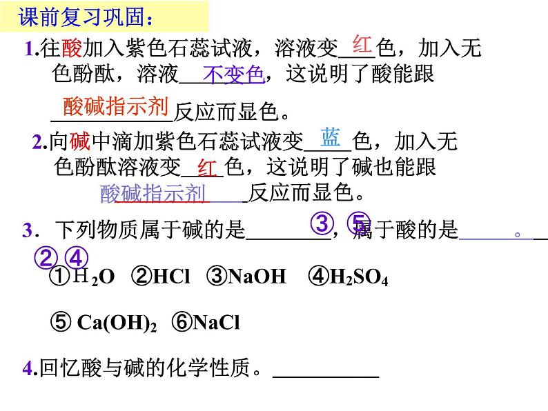 4.补充完成下列反应的化学方程式:① Ca(OH)2 + 2 HCl = + 2H2O② 2NaOH + = Na2SO4 + 2H2O③ 2KOH + H2SO4 = +2H2O④ + = NaNO3 + H2O