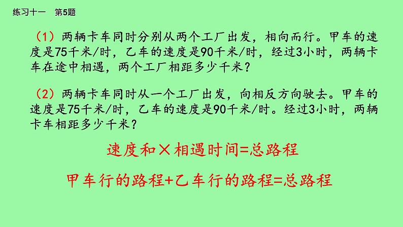 (1)两辆卡车同时分别从两个工厂出发,相向而行。甲车的速度是75千米/时,乙车的速度是90千米/时,经过3小时,两辆卡车在途中相遇,两个工厂相距多少千米?