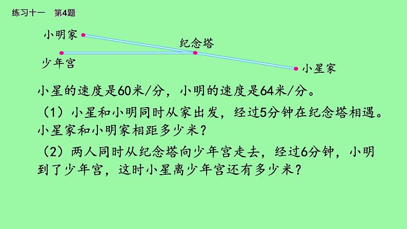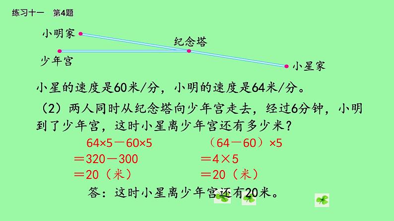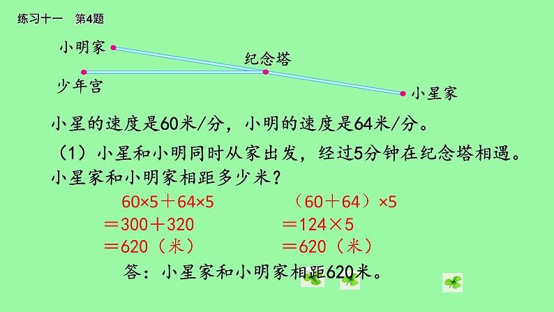 (1)小星和小明同时从家出发,经过5分钟在纪念塔相遇。小星家和小明家相距多少米?