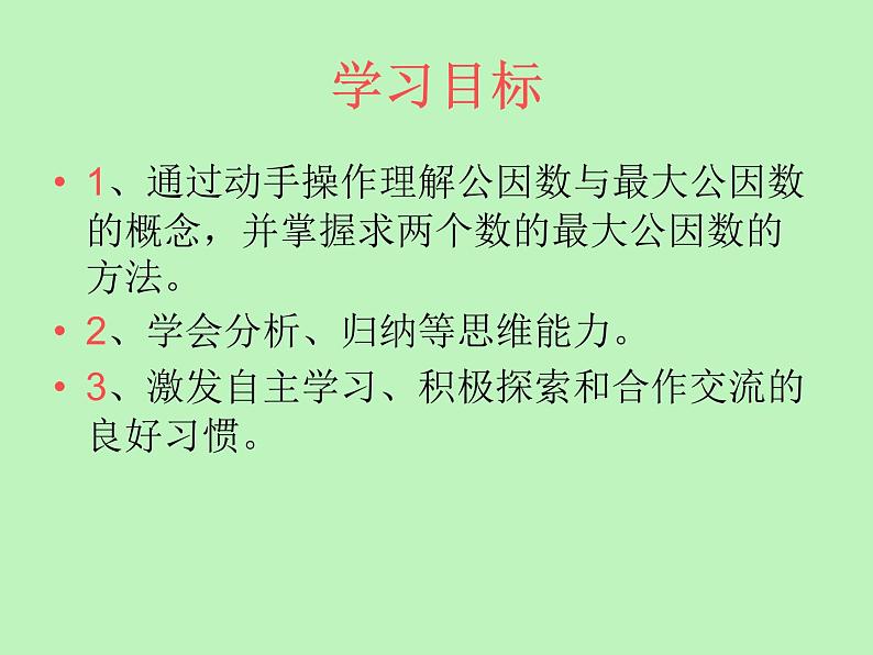 1、通过动手操作理解公因数与最大公因数的概念,并掌握求两个数的最大公因数的方法。2、学会分析、归纳等思维能力。3、激发自主学习、积极探索和合作交流的良好习惯。