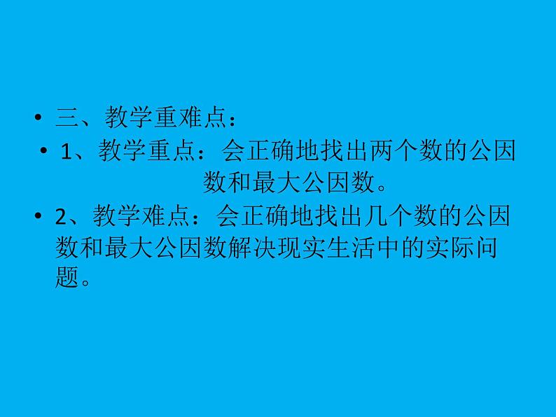 三、教学重难点:1、教学重点:会正确地找出两个数的公因 数和最大公因数。2、教学难点:会正确地找出几个数的公因数和最大公因数解决现实生活中的实际问 题。