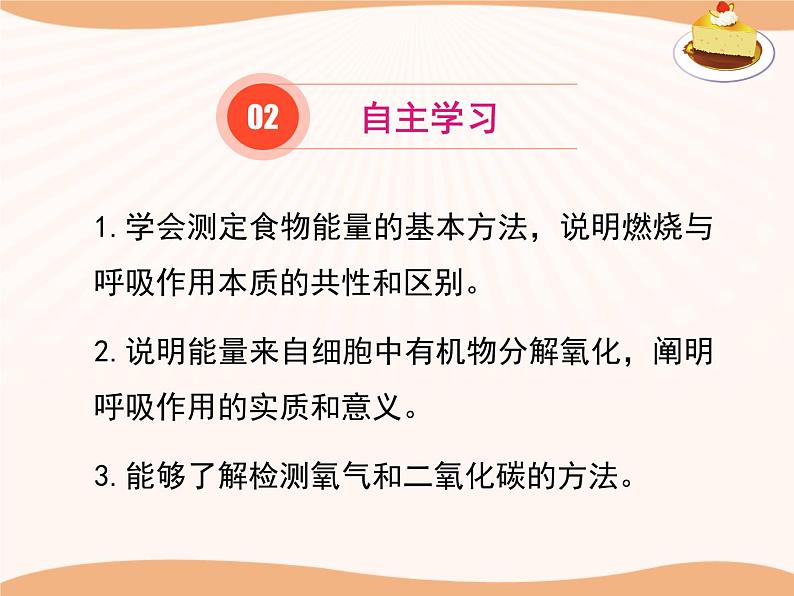 1.学会测定食物能量的基本方法,说明燃烧与呼吸作用本质的共性和区别。2.说明能量来自细胞中有机物分解氧化,阐明呼吸作用的实质和意义。3.能够了解检测氧气和二氧化碳的方法。