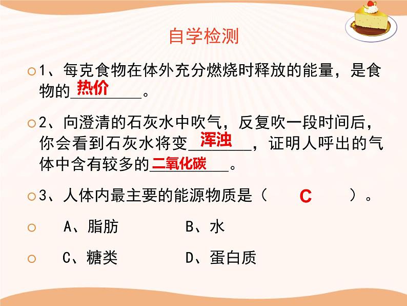 1、每克食物在体外充分燃烧时释放的能量,是食物的_________。2、向澄清的石灰水中吹气,反复吹一段时间后,你会看到石灰水将变________,证明人呼出的气体中含有较多的__________。3、人体内最主要的能源物质是()。A、脂肪B、水 C、糖类D、蛋白质