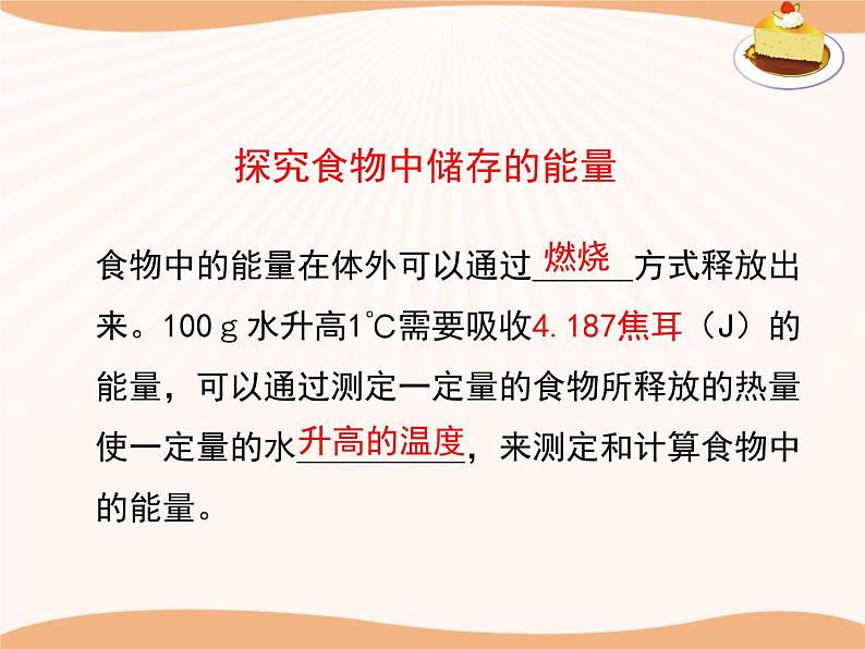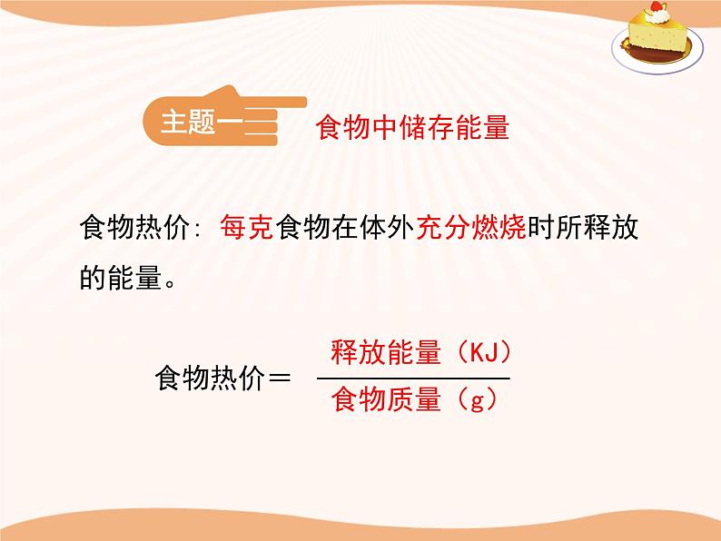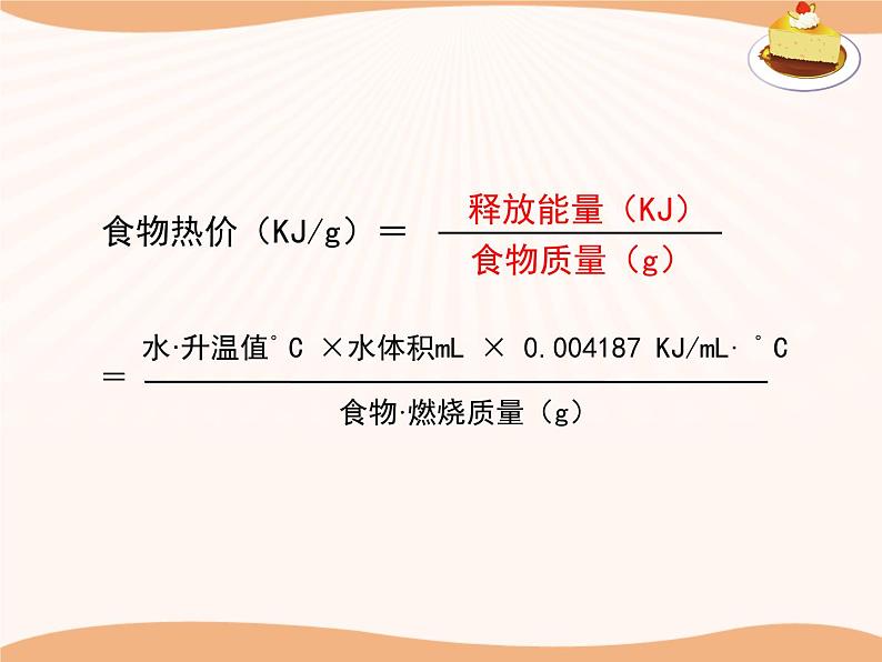 食物热价: 每克食物在体外充分燃烧时所释放的能量。