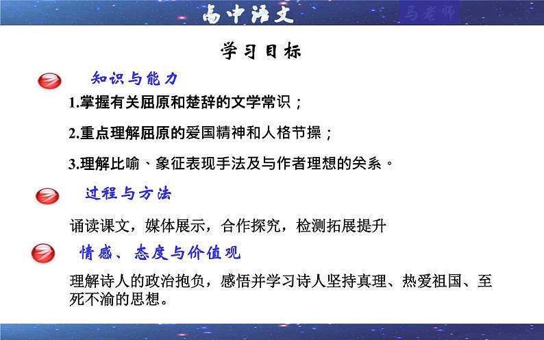 1.掌握有关屈原和楚辞的文学常识; 2.重点理解屈原的爱国精神和人格节操; 3.理解比喻、象征表现手法及与作者理想的关系。
