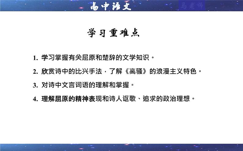 1. 学习掌握有关屈原和楚辞的文学知识。 2. 欣赏诗中的比兴手法,了解《离骚》的浪漫主义特色。 3. 对诗中文言词语的理解和掌握。 4. 理解屈原的精神表现和诗人讴歌、追求的政治理想。