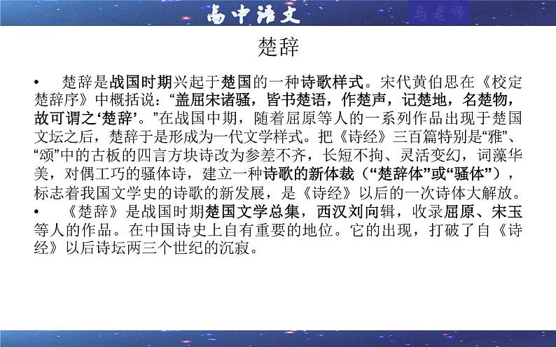 楚辞是战国时期兴起于楚国的一种诗歌样式。宋代黄伯思在《校定楚辞序》中概括说:“盖屈宋诸骚,皆书楚语,作楚声,记楚地,名楚物,故可谓之‘楚辞’。”在战国中期,随着屈原等人的一系列作品出现于楚国文坛之后,楚辞于是形成为一代文学样式。把《诗经》三百篇特别是“雅”、“颂”中的古板的四言方块诗改为参差不齐,长短不拘、灵活变幻,词藻华美,对偶工巧的骚体诗,建立一种诗歌的新体裁(“楚辞体”或“骚体”),标志着我国文学史的诗歌的新发展,是《诗经》以后的一次诗体大解放。《楚辞》是战国时期楚国文学总集,西汉刘向辑,收录屈原、宋玉等人的作品。在中国诗史上自有重要的地位。它的出现,打破了自《诗经》以后诗坛两三个世纪的沉寂。
