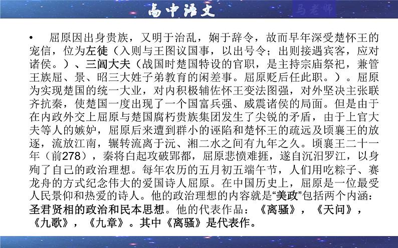 屈原因出身贵族,又明于治乱,娴于辞令,故而早年深受楚怀王的宠信,位为左徒(入则与王图议国事,以出号令;出则接遇宾客,应对诸侯。)、三闾大夫(战国时楚国特设的官职,是主持宗庙祭祀,兼管王族屈、景、昭三大姓子弟教育的闲差事。屈原贬后任此职。)。屈原为实现楚国的统一大业,对内积极辅佐怀王变法图强,对外坚决主张联齐抗秦,使楚国一度出现了一个国富兵强、威震诸侯的局面。但是由于在内政外交上屈原与楚国腐朽贵族集团发生了尖锐的矛盾,由于上官大夫等人的嫉妒,屈原后来遭到群小的诬陷和楚怀王的疏远及顷襄王的放逐,流放江南,辗转流离于沅、湘二水之间有九年之久。顷襄王二十一年(前278),秦将白起攻破郢都,屈原悲愤难捱,遂自沉汨罗江,以身殉了自己的政治理想。每年农历的五月初五端午节,人们用吃粽子、赛龙舟的方式纪念伟大的爱国诗人屈原。在中国历史上,屈原是一位最受人民景仰和热爱的诗人。他的政治理想的内容就是“美政”包括两个内涵:圣君贤相的政治和民本思想。他的代表作品:《离骚》,《天问》,《九歌》,《九章》。其中《离骚》是代表作。