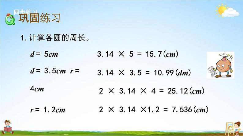 1.计算各圆的周长。d = 5cmd = 3.5cm r = 4cmr = 1.2cm