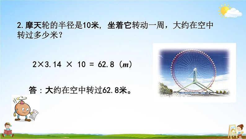2.摩天轮的半径是10米,坐着它转动一周,大约在空中 转过多少米?