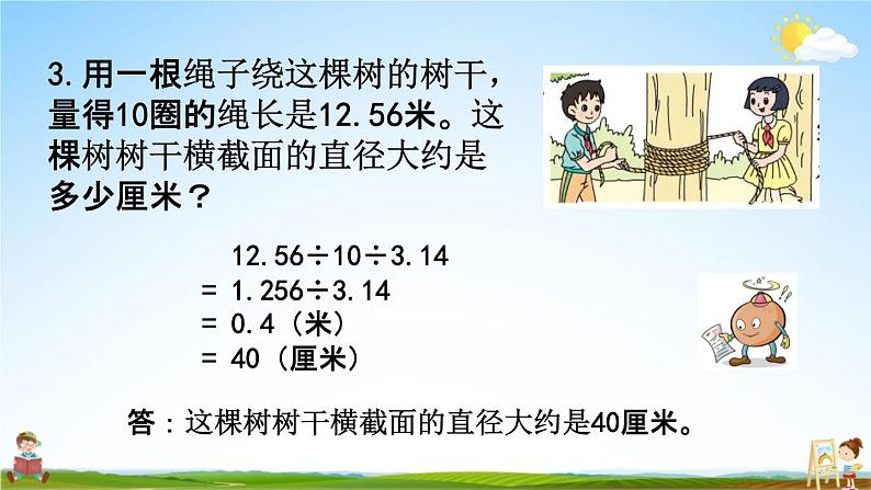 3.用一根绳子绕这棵树的树干, 量得10圈的绳长是12.56米。这 棵树树干横截面的直径大约是 多少厘米?