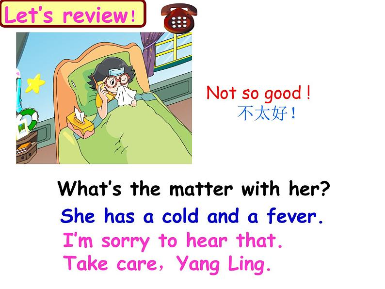 A: Hell. This is Yang Ling speaking. May I speak t…?B:Hell, Yang Ling. This is ….A: Hw are yu ?B: Nt s gd. I have…A:I’m srry t hear that. Take care, : Thank yu.