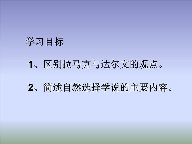 学习目标 1、区别拉马克与达尔文的观点。 2、简述自然选择学说的主要内容。