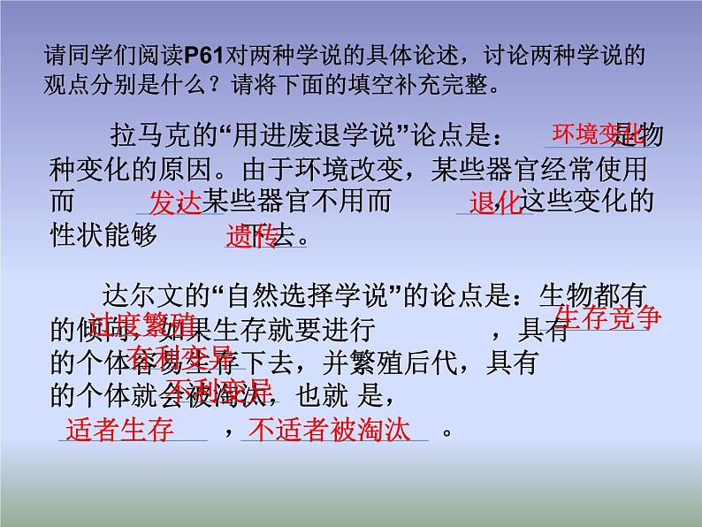 请同学们阅读P61对两种学说的具体论述,讨论两种学说的观点分别是什么?请将下面的填空补充完整。