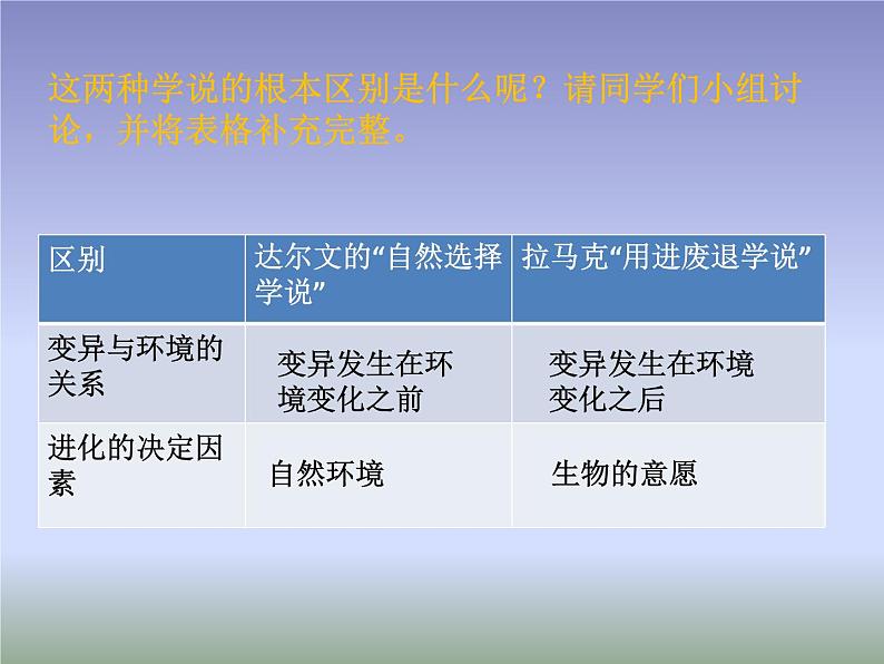 这两种学说的根本区别是什么呢?请同学们小组讨论,并将表格补充完整。