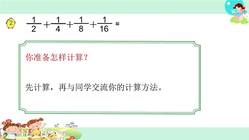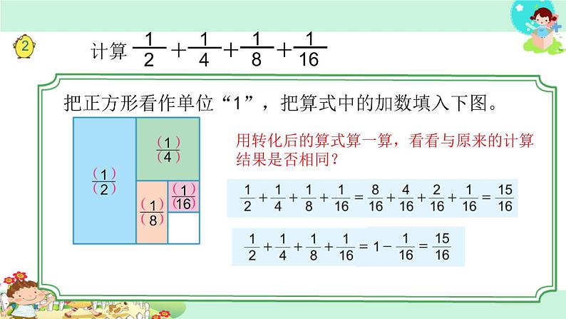 空白部分占大正方形的几分之几?把算式和图形联系起来想一想,原来的算式可以怎样转化?